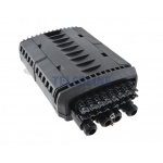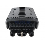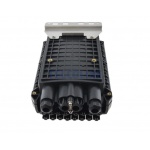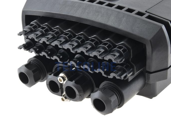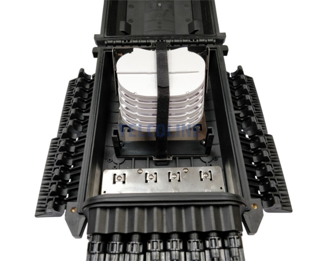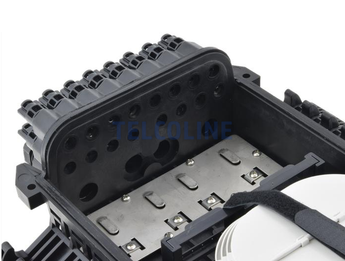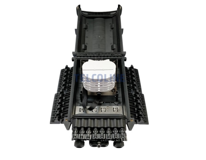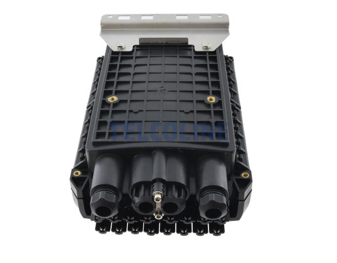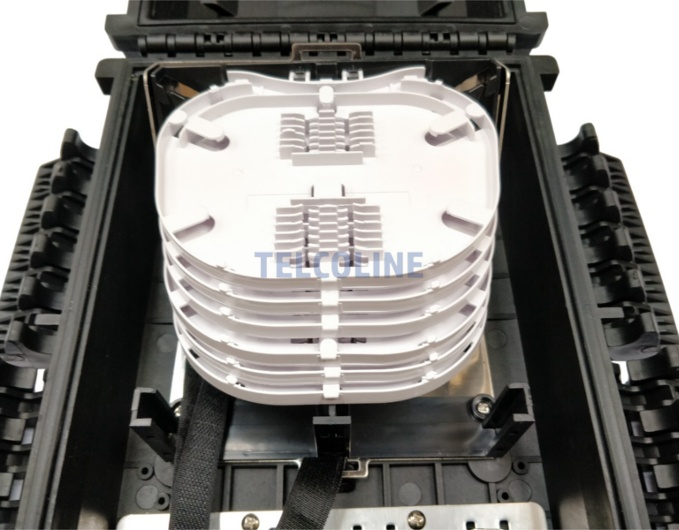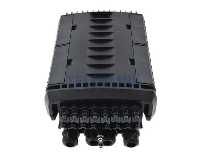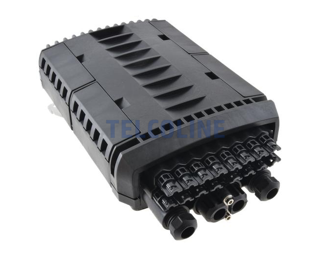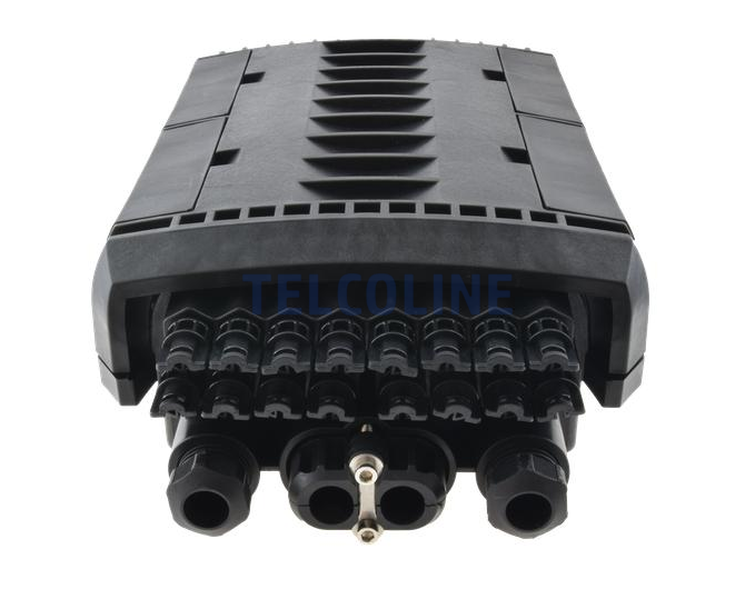 Mufo-przełącznica TELCOLINE GFP-16C posiada cztery wejścia na kabel magistralny, oraz 16 wyjść na kable klienckie. Została zaprojektowana do montażu naściennego z możliwością instalacji na słupach telekomunikacyjnych. Dzięki wysokiemu stopniowi ochrony IP67 (6 - ochrona pyłoszczelna, 7 - ochrona przed skutkami krótkotrwałego zanurzenia w wodzie) oraz trwałej i solidnej konstrukcji jest idealnym rozwiązaniem do instalacji napowietrznych, doziemnych i kanalizacyjnych. Urządzenie posiada 6 odchylanych tacek światłowodowych z możliwością ułożenia do 24 spawów na każdej. Mufa wyposażona jest dodatkowo w miejsce na montaż 24 adapterów światłowodowych typu SC simplex lub LC duplex. Polipropylen PP, na bazie, którego została wyprodukowana mufa charakteryzuje się bardzo dobrą odpornością chemiczną, wysoką izolacją elektryczną oraz nie absorbuje wilgoci. Dodatkowo chroni przed niskimi i wysokimi temperaturami (od -30 °C do +80 °C) oraz promieniowaniem UV. Wszystkie wloty i wyloty uszczelnione są gumowymi tulejami, a dwa środkowe wejścia na kable główne są dwudzielne. Maksymalna średnica na przewody wlotowe to 18 mm. Konstrukcja mufy pozwala na swobodny dostęp do jej środka w przypadku konieczności serwisu, konserwacji lub instalacji nowych elementów.
