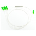 Splitter PLC z podziałem mocy optycznej 1:4. Włókna w powłoce typu pigtail o średnicy 0.9 mm (1 m długości). Splitter zakończony złączami optycznymi SC/APC wykonany w klasie Gold.
