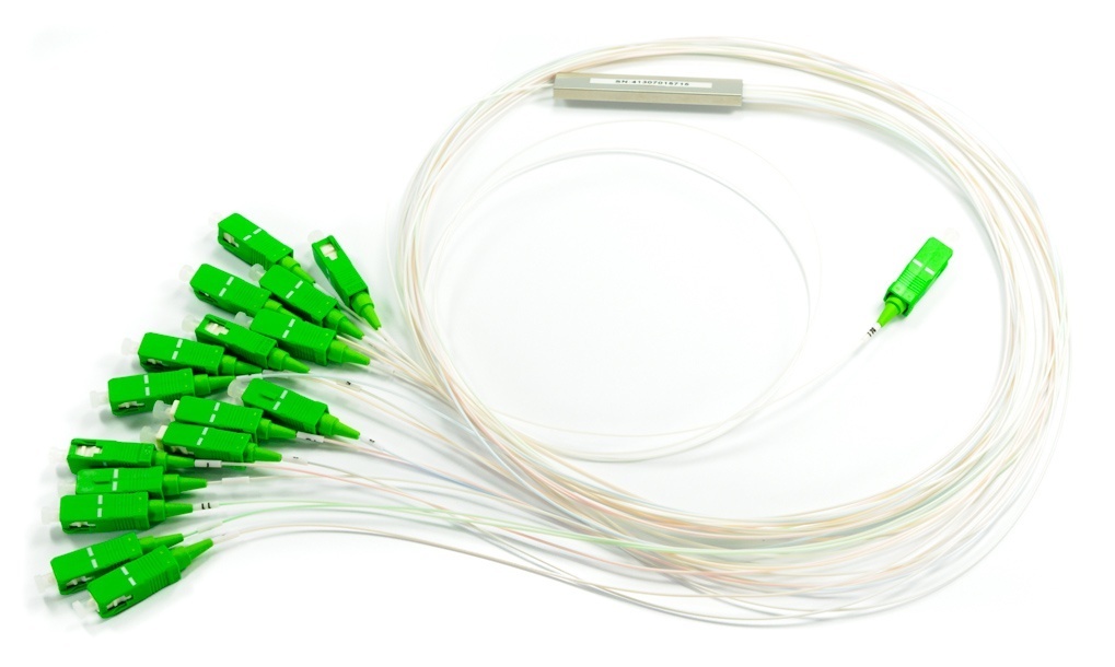 Splitter PLC z podziałem mocy optycznej 1:32. Włókna w powłoce typu pigtail o średnicy 0.9 mm (1 m długości). Splitter zakończony złączami optycznymi SC/APC wykonany w klasie Gold.