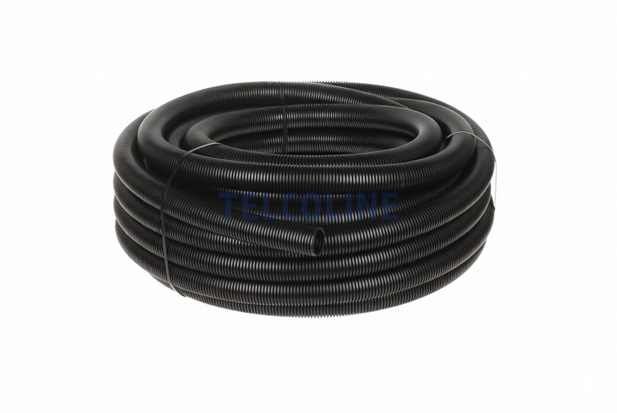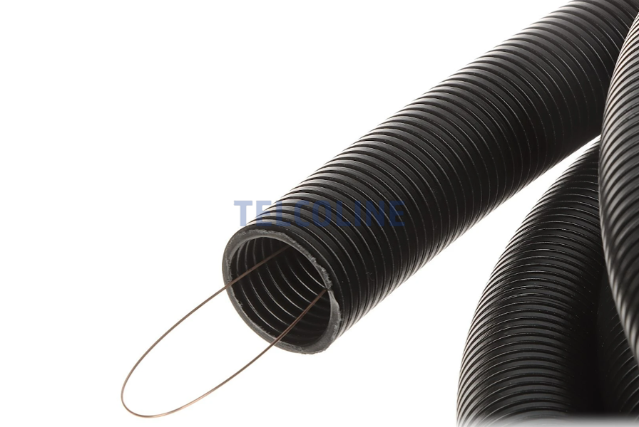 Rura elektroinstalacyjna karbowana giętka, nie rozprzestrzeniająca płomienia wykonana z PVC w kolorze czarnym ze stalowym pilotem ułatwiającym przeciąganie przewodów.
